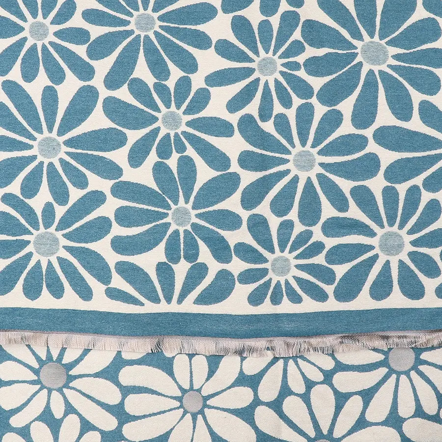 Dusky teal blue and ecru jacquard scarf with retro daisy pattern and eyelash fringe