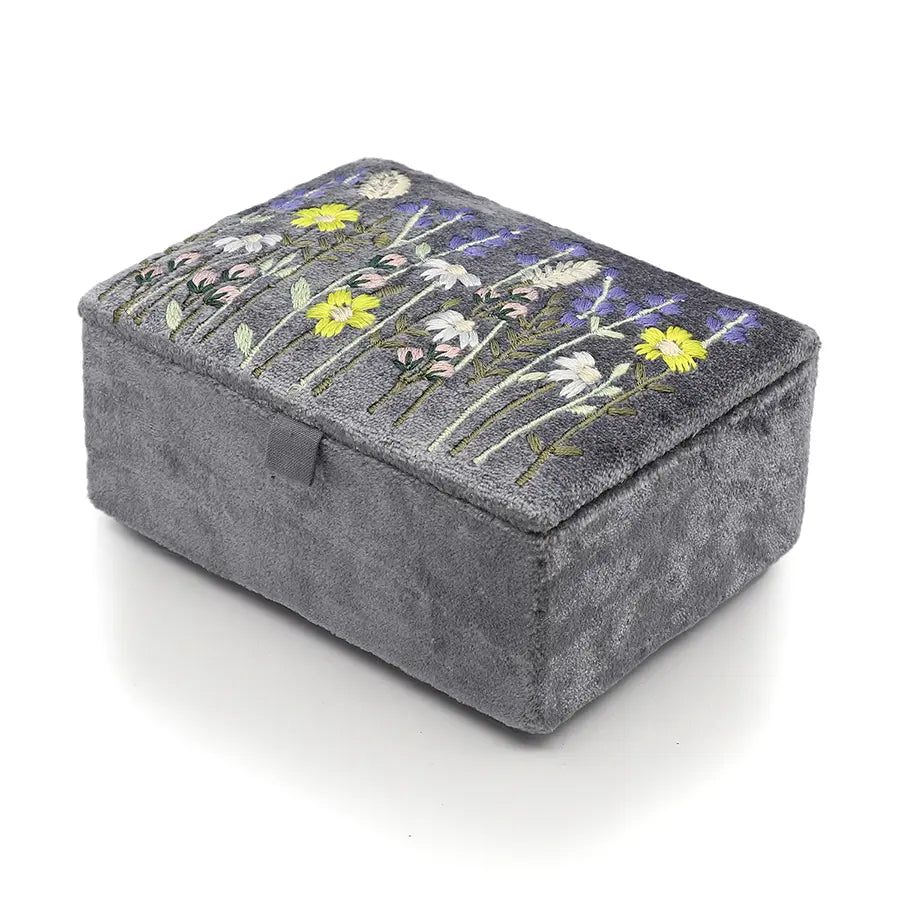 Smoky grey cotton velvet jewellery box with embroidered lavender meadow