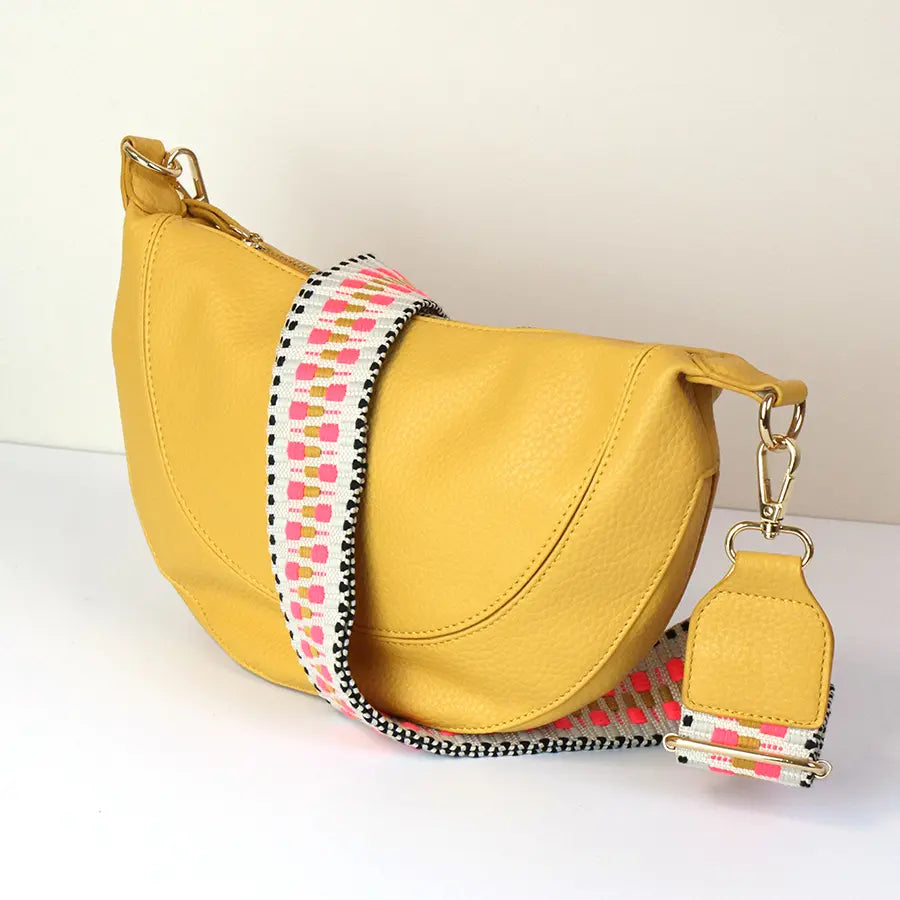 Vegan Leather half moon bag in lemon with woven zig-zag removable strap. Our Vegan Leather bags contain no animal derivatives and are fully lined.
